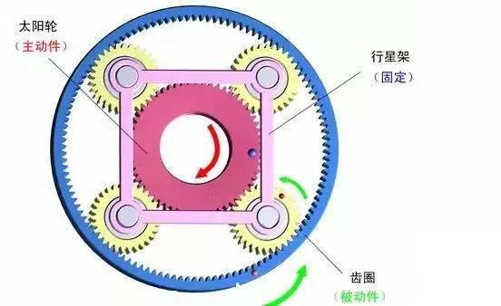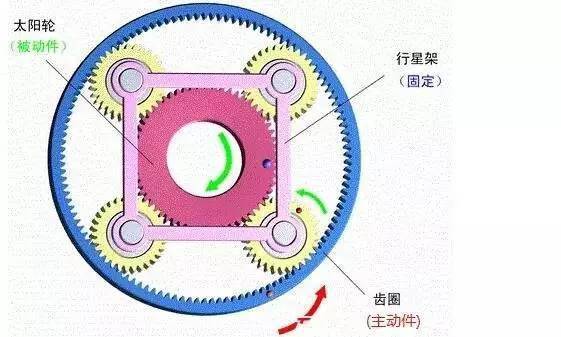 5)行星架固定,太阳轮主动,齿圈被动。